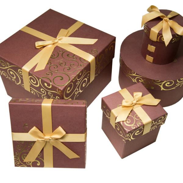 Custom Gift Packaging Box With Ribbon is a set of chocolated , candy, other items, there are two piece top and based box , adding fancy paper wrap grey board with gold foil and ribbon.